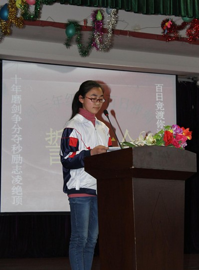 當天下午2時整,誓師大會正式開始,全體起立,奏唱國歌。伴隨著嘹亮的國歌聲響徹云霄,全體師生精神飽滿,愛國之情油然而生。隨后,學校校長李金玉發表了熱情洋溢的講話,她鼓勵初三年級全體師生再接再厲,不負學校厚望,對最后100天的教學提出了具體要求和指導性意見。緊接著,老師代表上臺發言。老師的殷切希望,諄諄教誨又有一次鼓舞了在座的全體學子。接下來,學生代表上臺發言。學生代表表示,在最后的100天里,決心集中全部精力打好基礎,科學合理分配時間,不斷調整自己的學習方法,以百倍的信心戰勝一切困難,勇奪2014年中考佳績,回報父母的養育之恩,回報恩師的教導之情,將來成為對國家有用之才。同時,會議特別安排了家長代表發言。家長代表樸實的話語充滿著對學校、孩子們的殷切希望,既有鼓勵,更飽含著期待。