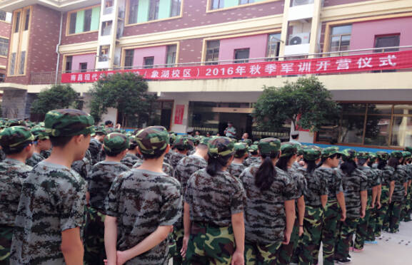 8月22日上午,南昌現代外國語學校(象湖校區)2016級初一新生軍訓開營儀式在學校操場隆重舉行。學校部分行政人員、初一全體班主任老師、武警中隊的11名教官及2016級初一近500名新生參加了開營儀式。儀式由王桂紅副校長主持,校長李金玉致辭,副校長胡卓越宣布軍訓紀律及安排,李教官和新生代表符昕悅講話。