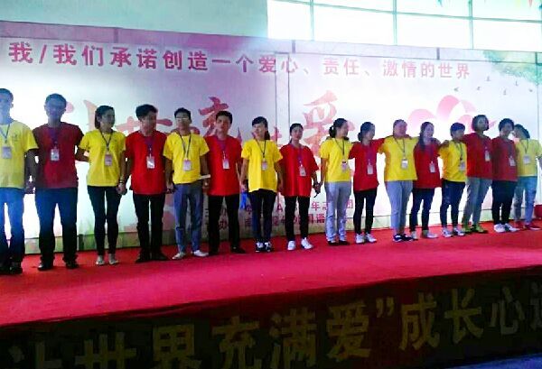 早在活動正式舉辦前,成長心連心公益團隊就與我校多次協商,希望布置出一個溫馨美麗、充滿愛意的活動環(huán)境。18日,熱心的義工們忙里忙外了整整一天,精心打造出了愛的家園,將夢想變成現實。校門口搭建了紅色的彩虹門,會場外有簽到墻、活動牌,不時有彩色氣球點綴其中。會場內除了搭建巨型舞臺外,還在舞臺四周共放置了許多大展板,上面分別寫著“表達愛、奉獻愛、傳遞愛”、“愛要說出來才是愛”、“我、我們承諾創(chuàng)造一個和平、共贏的世界”、“讓世界充滿愛”等大標語。這些滾燙的話語讓每一個進入會場的人都熱血沸騰、激情滿懷。
