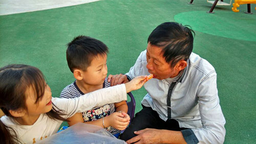 孩子給爺爺奶奶們喂重陽糕(一)