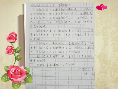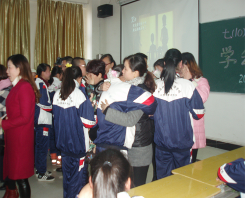 在感恩父母的環(huán)節(jié)中,主持人展示一系列關(guān)于自己父母的問(wèn)題向同學(xué)們提問(wèn),考查同學(xué)們對(duì)自己父母的了解程度。緊接著播放視頻《人的一生,感恩教育》 ,短片中浮現(xiàn)出我們從小到長(zhǎng)大成人及父母從年輕到年邁各階段的特征,旨在培養(yǎng)學(xué)生的感恩之心。視頻過(guò)后,展示的是一名叫章鈺同學(xué)寫(xiě)給爺爺奶奶的一封信。章鈺三歲時(shí),父母就分開(kāi)了,爺爺奶奶撫養(yǎng)了章鈺整整十年。在這十年間,爺爺奶奶承擔(dān)了太多本該章鈺父母承擔(dān)的責(zé)任。寒冬里,他們起早床,為孫女準(zhǔn)備早餐,洗衣服。晚上,悉心為孫女蓋被子。十年間,章鈺在慢慢長(zhǎng)大,爺爺奶奶卻在慢慢變老。借此機(jī)會(huì),章鈺同學(xué)利用攢下的零花錢(qián),為爺爺奶奶獻(xiàn)上了一份真摯的禮物,感謝他們的養(yǎng)育之恩。此時(shí),《時(shí)間都去哪了》從耳邊傳來(lái),三人相擁而泣。情到深處,感人肺腑,全場(chǎng)為之動(dòng)容,在座的校長(zhǎng)、老師、家長(zhǎng)、同學(xué)們都流下感動(dòng)的淚水。借著章鈺同學(xué)對(duì)爺爺奶奶的深情傾訴,主題班會(huì)來(lái)到了此環(huán)節(jié)的最后一部分,部分同學(xué)給父母獻(xiàn)禮,同學(xué)們紛紛感激父母的養(yǎng)育之恩,對(duì)自己的不懂事表示深深的愧疚。