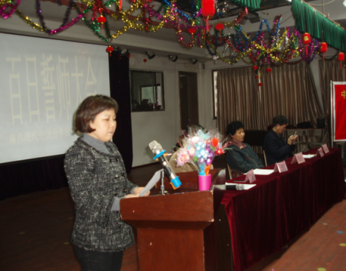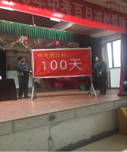 本次大會由年級組長王康民老師主持。首先,在一陣悠揚激昂的國歌聲后,李金玉校長、王桂紅校長作為校領導代表在全體師生的共同見證下,拉開了百日沖刺誓師大會的倒計時牌匾,那醒目的“100天”字樣燦爛生光,照進了每一個師生的心間。會上,李金玉校長首先作了重要講話。她在講話中指出:中考的路上不單單是知識的較量,更重要的是心態的較量,還有毅力、耐力、意志品質的考驗。每個同學都要有鍥而不舍、孜孜以求、拼搏奮斗的精神,要有贏的強烈欲望。她希望老師要以最真摯的情感、以最優秀的教學質量、最先進的教育理念、全力以赴,恪盡職守,把握有限的時間,科學合理安排教學進度,以最無私的投入、關愛學生身心健康,做到一個都不放棄!希望家長要全力配合學校老師,做好孩子的心理疏導,教育孩子要有自信、敢于擔當。最后,李校長總結了歷年中考成績,尤其是2015屆的初三畢業生394人,有100人中考考分在500分以上,考取省級第一批重點中學。