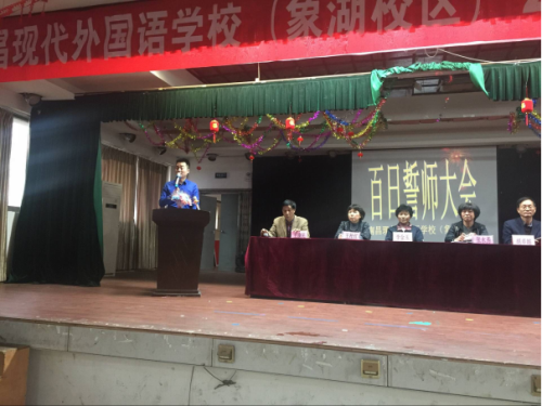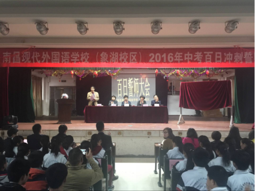 陽春三月,春寒料峭,憧憬六月,激情滿懷。為鼓舞初中畢業班學生的斗志,讓他們揚起自信的風帆,信心百倍的迎接中考,2016年3月8日下午,南昌現代外國語學校(象湖校區)隆重舉行“2016年中考百日沖刺誓師大會”,學校行政領導,初三全體教師、同學及家長代表500余人參加了這次大會。