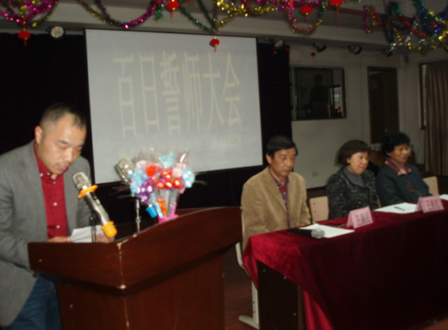 緊接著,教師代表陳一鳴老師在會上作了激情洋溢的講話道出全體老師的心聲:愿與同學們一道攻堅克難,奮戰百天,甘心做學生成長成功的鋪路石。在陳老師富有激情的發言后,全體的初三教師個個斗志昂揚,在主席臺大聲宣誓,明確了作為教師的責任和目標。同時,家長代表的發言更是讓我們感受到了社會對我們學校工作的支持與認可。接著優秀學生代表焦慧婷同學做了表態發言,暢談自己的學習方法與經驗,決心遵照學習計劃,珍惜最后的寶貴學習時光,奪取優異成績。