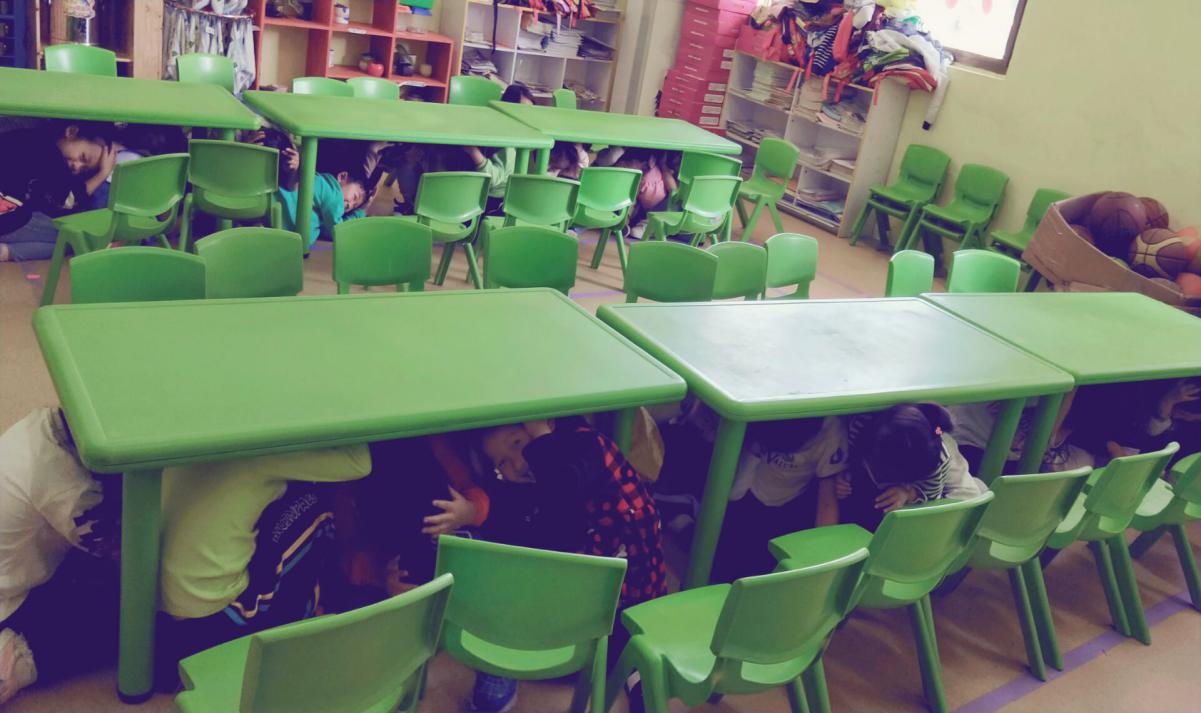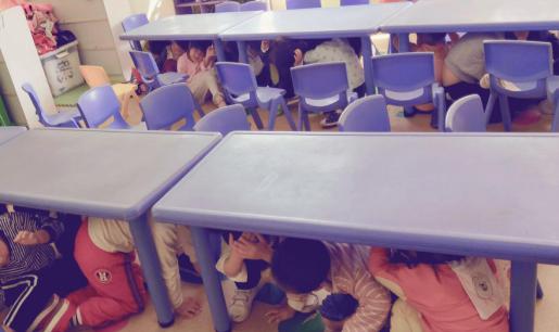 下午2點30分,隨著一陣急促的鈴聲,演習開始了。孩子們在老師的引導下,紛紛選擇桌子、廁所管道等地方進行躲避,“抱頭”、“閉眼”、“蹲下”,老師們不時的提醒著孩子們。兩分鐘后,緊急鈴聲再次響起,孩子們在老師的帶領下,快速有序地經過安全出口,撤離到安全區域。