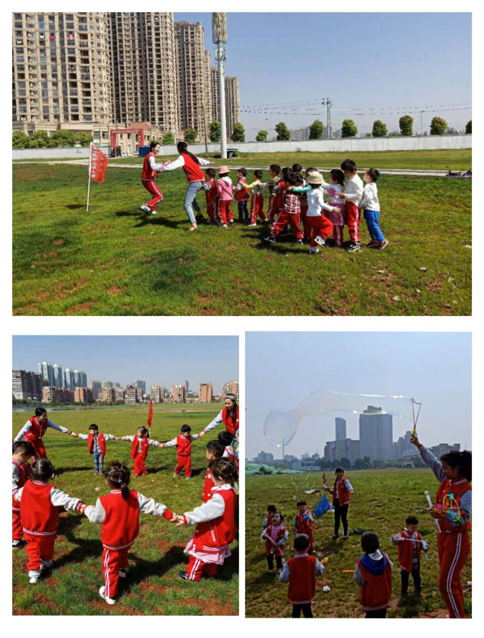 活動(dòng)根據(jù)不同年齡段的幼兒開展主題內(nèi)容。小班的孩子看到什么景象就如同發(fā)現(xiàn)新大陸一樣,帶著好奇的心向老師問了很多童趣的問題:老師,是什么這么香?小草是種子發(fā)芽了嗎?等等。老師也總是耐心適時(shí)的引導(dǎo):春天是淡淡的花香,春天是漂亮的嫩芽,春天還是溫暖的風(fēng)……。老師和孩子們?cè)趶V闊的草坪上嬉戲奔跑,幼兒興味盎然。