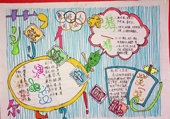 語文教材第五組《綜合性學習:遨游漢字王國》是引導學生進行綜合性學習,初步了解漢字的特點和發(fā)展歷史,加深學生對漢字和中華傳統(tǒng)文化的感情,提高正確運用漢字的自覺性。同時培養(yǎng)學生策劃和開展活動、查找和運用資料的能力。比賽前語文老師組織學生學習了有關課文,讓學生收集“有趣的漢字”各方面的知識,并通過自己靈巧的雙手,精心設計版面,創(chuàng)作出了一幅幅色彩艷麗、構思獨特、內容豐富的手抄報。本次手抄報內容涉及有趣的字謎、倉頡造字、一點值千金、諧音歇后語、諧音笑話、字的來歷等方面的知識,收到了很好的教育效果。
