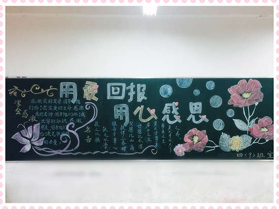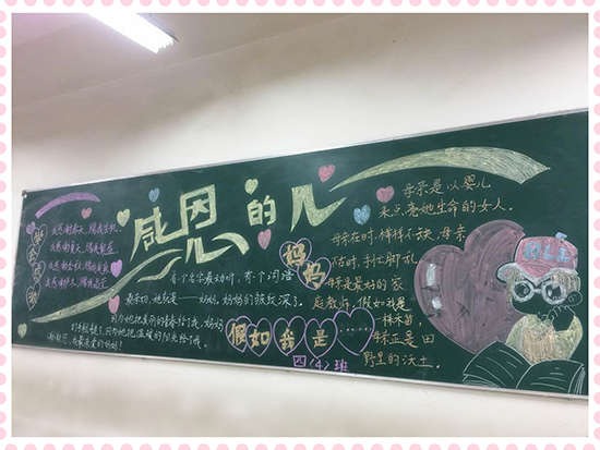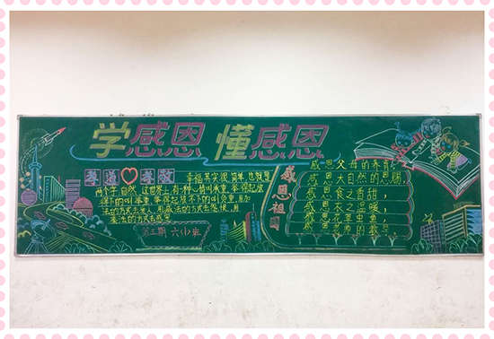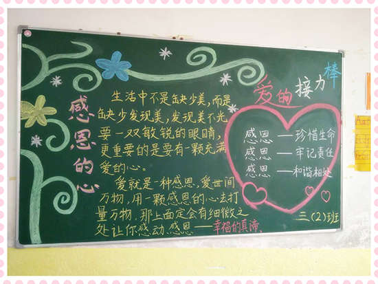 本期黑板報美觀靚麗,精彩紛呈,讓同學(xué)們通過參與,懂得了感恩的重要,懂得了怎樣去感恩別人,學(xué)會了對父母、學(xué)校、社會心懷感激之情,為校園文化增添了一道亮麗的風(fēng)景線。