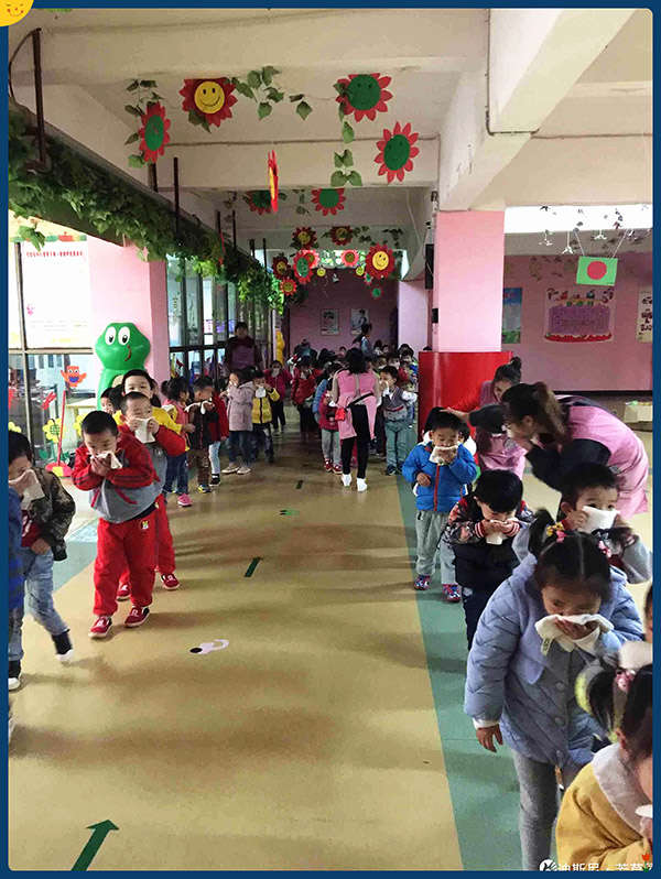 隨著消防報警聲的響起,各班教師依據疏散路線快速、有序地帶領幼兒用濕毛巾捂住口鼻、貓著腰,快步下樓疏散到了操場,整個演練活動做到快速、安全、有序。