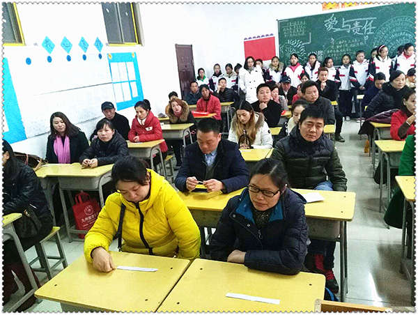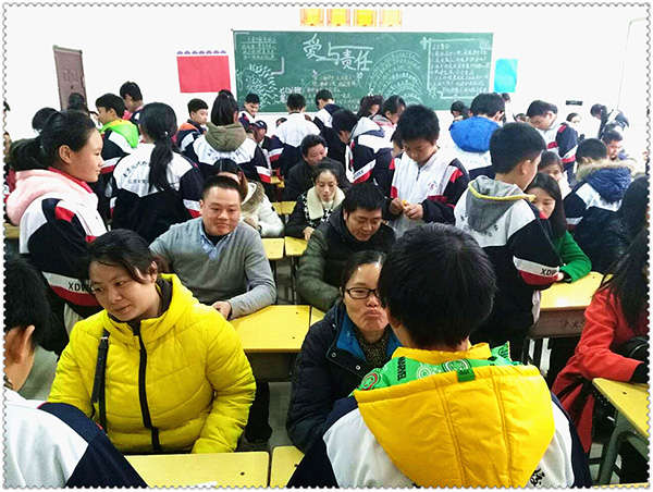 家長會上,班主任智慶瑾老師首先代表學校、各科任課老師致辭。在和諧美好的氛圍中,同學們隨著音樂的節拍齊唱筷子兄弟的歌曲《父親》,家長們聚精會神地聽著,深情的歌聲讓家長們流下了感動的淚水。歌曲結束,孩子們主動為各位家長剝桔子,并親自送到家長口中,彎腰鞠躬道謝:“爸媽,你們辛苦了”。場面其樂融融,大家洋溢在幸福和感恩的場景之中。