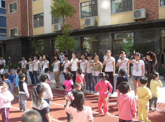 9月29日,在迪斯尼幼兒園、園外園幼稚園的操場上,響起了早操律動音樂,可愛的寶寶們在操場上跟隨著老師們的步伐,蹦蹦跳跳起來。在老師的帶動下,在場的家長們也紛紛加入進來,和寶寶們一起又唱又跳。迪斯尼幼兒園的老師們表演了民族舞《天藍藍》,還進行了古箏、個人舞的才藝表演,展示了幼兒園老師們朝氣蓬勃的精神面貌。園外園幼稚園的老師們也不甘示弱,在現場以特有的方式展現了幼兒園的承諾、愿景、文化。