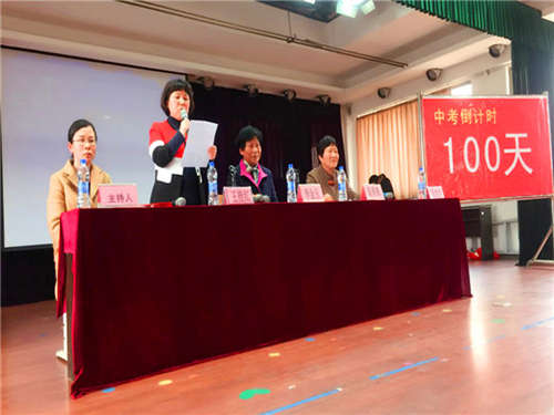 會(huì)議在雄壯激昂的國歌聲后,李金玉校長、陳勇鋒副校長作為校領(lǐng)導(dǎo)代表在全體師生的共同見證下,拉開了百日沖刺的倒計(jì)時(shí)牌匾,那醒目的“100天”字樣燦爛生光,照進(jìn)了每一個(gè)師生的心間。會(huì)上,李金玉校長作了動(dòng)員報(bào)告,她講到,中考的路上不單單是知識(shí)的較量,更重要的是心態(tài)的較量,還有毅力、耐力、意志品質(zhì)的考驗(yàn)。每個(gè)同學(xué)都要有鍥而不舍、孜孜以求、拼搏奮斗的精神,要有贏的強(qiáng)烈欲望。并希望全體教師以最佳的備課方案、優(yōu)質(zhì)的課堂教學(xué)、真摯的感情與學(xué)生們同舟共濟(jì),做好最堅(jiān)強(qiáng)的后盾。請(qǐng)同學(xué)們把父母的聲聲叮嚀,師長們的殷切期盼化著動(dòng)力。用100天給自己一個(gè)機(jī)會(huì),用100天為自己創(chuàng)造一個(gè)奇跡,用100天送給關(guān)愛你的人一個(gè)“驚喜”。讓我們挑戰(zhàn)2017年的中考,再創(chuàng)學(xué)校的輝煌!