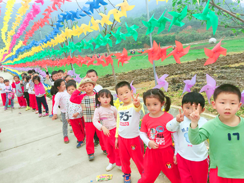 到達(dá)目的地后迎接我們的是彩虹風(fēng)車,孩子們看見風(fēng)車后都興奮地跑去與風(fēng)車合影。