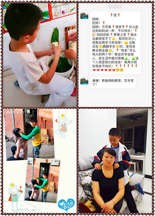 孩子們在學校的倡導下,紛紛在家里幫助媽媽完成一件力所能及的事情。有的親手為媽媽梳一梳頭發,讓自己的媽媽更年輕漂亮;有的幫媽媽洗碗干家務,讓媽媽有空閑的時間去干自己想做的事情;有的孩子為媽媽捶捶背,解除媽媽一天工作的疲勞;有的孩子精心炒媽媽喜歡吃的各種菜,讓媽媽品嘗孩子為做的美味佳肴;有的孩子為媽媽洗了一次腳,讓媽媽能夠暖暖的入睡;有的孩子為在外打工的母親送去溫馨的祝福語問候;有的孩子為媽媽送去鮮花,祝媽媽節日快樂……在為媽媽做一件貼心事的同時,孩子們也沒忘記心愛的老師,紛紛給女老師們送上祝福和問候,個別同學還為女老師送上了精美的卡片,感謝老師們的傾情付出。