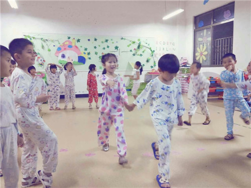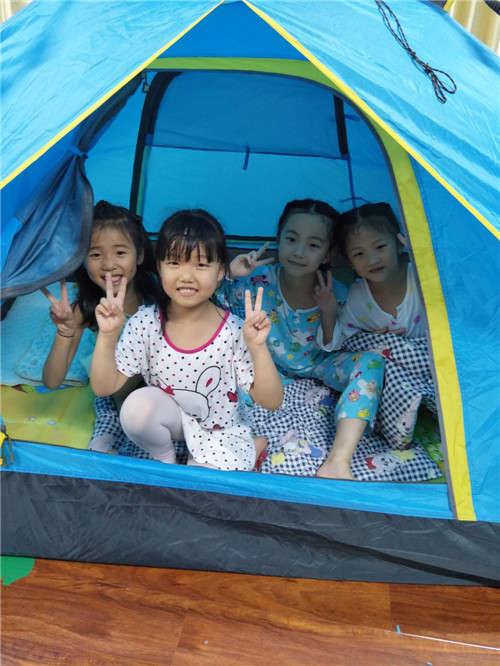 當晚,小朋友都穿上了各自的睡衣來幼兒園,舉行了一場睡衣趴活動,孩子們穿著五顏六色的睡衣上演“睡衣走秀”,大家開心地都合不攏嘴。晚上八點準時在各班觀看老師給幼兒們準備的電影,讓孩子在幼兒園里也體驗到了電影院里的氣氛。活動后,孩子們還品嘗到了甜甜蜜蜜的點心和水果。最后,所有活動結束后,孩子們在老師的指導下,紛紛搭好了自己的小帳篷,紛紛洗漱完后,都走進一個個小帳篷進入了夢鄉。