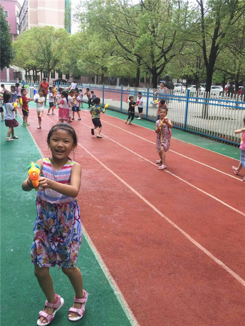 活動(dòng)中,每個(gè)孩子做了充分準(zhǔn)備,有雨衣、雨靴、備用衣物,最吸引眼球的還屬威力不同的水槍裝備,有大小不同的水槍、各種卡通造型的水槍、“噴霧器式”水槍等。在活動(dòng)中,有的班級(jí)的孩子打起了“保衛(wèi)戰(zhàn)”,“開戰(zhàn)!”老師一聲令下,孩子們互相噴射起來,個(gè)個(gè)都神勇無比,不甘示弱。孩子們充分體驗(yàn)了玩水槍的快樂,此時(shí),幼兒園變成了歡樂的海洋。在水槍大戰(zhàn)中老師加入到孩子們的隊(duì)伍中,像做戰(zhàn)指揮官一樣率領(lǐng)著小朋友們盡情地開展玩水游戲,尖叫聲、歡笑聲、吶喊聲,此起彼伏,幼兒園頓時(shí)沸騰起來,變成了一片歡樂的海洋。