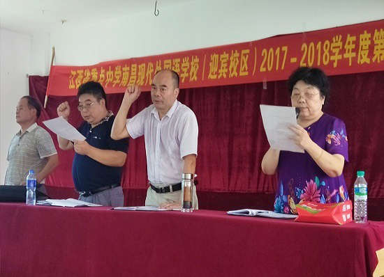 會議第一項為介紹新老師,因學校的發展與規模的擴大,該校今年新納了36位新教師。這一批新教師,以有經驗的年輕人為主力軍。第二項由特聘江西省特高級教師、第一批學科帶頭人錢老師作為教研顧問發表講話,他的講話重點圍繞“教書育人”這一中心,告訴大家要關心學生,教會學生學習、溝通的能力;要樹立“一切為了學生”的思想,教師本身不斷地學習,形成名師效應。第三項由付紹玫校長宣讀市教育局“進一步加大在職教師有償家教管理”的重要文件。第四項,楊端煌校長宣讀承諾書,承諾對學校依法管理,誠信管理,民主管理。維護學校利益,保障教師權益。全體教師承諾教書育人,愛校敬業,尊重領導和家長,遵守學校規章制度。