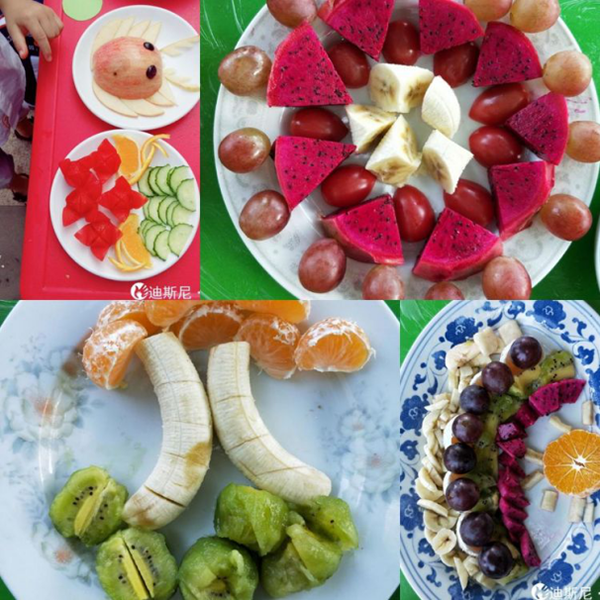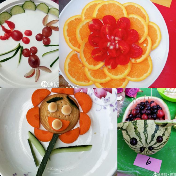 在親子活動結(jié)束后,家長和孩子們開始將帶來的水果以及事物進行腦洞大開的創(chuàng)意DIY啦!各式各樣的水果色彩繽紛,在大家的共同努力下,形態(tài)各異的創(chuàng)意水果拼盤呈現(xiàn)在大家眼前,有黃瓜擺成竹子造型的“步步高升”,餅干、胡蘿卜、黃瓜拼成的“向日葵”,圣女果做的“小金魚”……