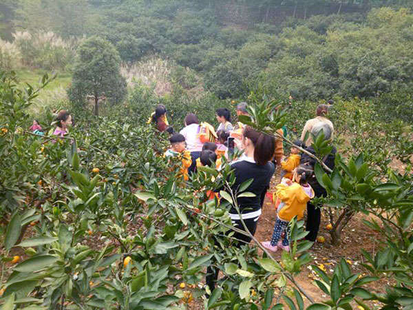 在這綠樹掩映,青水環繞的大自然中,各班精心組織了親子游戲,孩子們就像放飛的小鳥,在大自然中感受自由和快樂。游戲結束后,孩子們在爸爸媽媽、爺爺奶奶的帶領下進入果園采摘桔子,撿板栗……果園里金色的桔子掛滿枝頭,孩子們身穿紅色、黃色的校服孩子容入綠色和金色的果園里,遠遠望去,就像一道道彩帶,在山中游動,為這果園增設了一道亮麗的風景線。家長和孩子們在這山青水秀的中盡情嬉戲,歡笑聲響徹溶入山水之中。