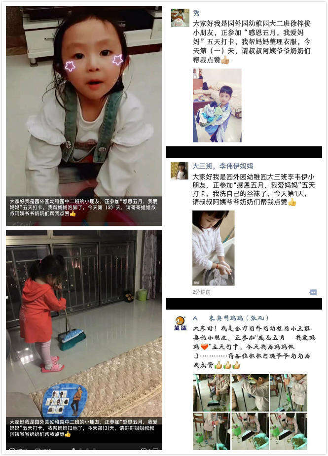 本周我園教師,教師還鼓勵孩子們在家以不同的方式表達對媽媽的愛,有的孩子給媽媽洗洗腳,有的孩子幫媽媽做家務,還有的孩子給媽媽獻上自己制作的花兒,并對媽媽大聲喊出:“媽媽,我愛您!