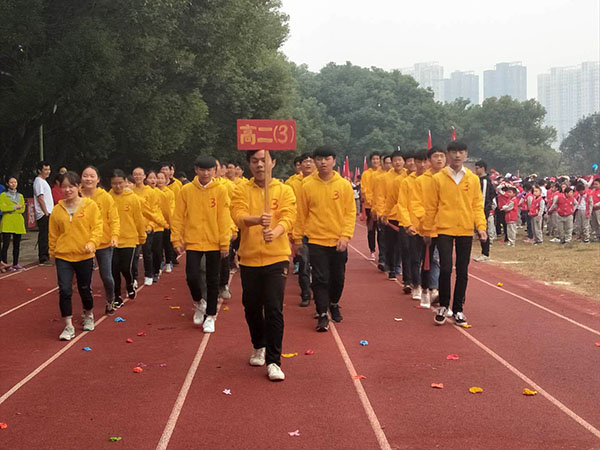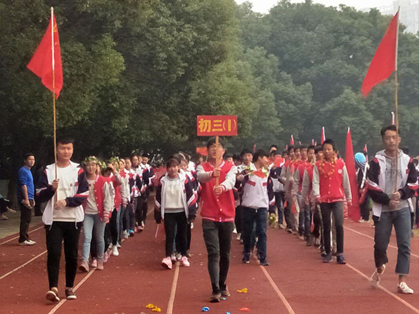 下午兩點,運動會入場儀式在初中部鄧華校長充滿激情的開幕式致辭中正式開始。伴隨著雄壯的《運動員進行曲》國旗護衛隊踏著整齊的步伐率先經過主席臺接受檢閱,整齊劃一、嚴肅莊重。校徽隊、彩旗隊緊隨其后,精神抖擻、意氣風發。41支班級方陣代表隊壓軸入場,或變換隊形,或揮舞花球,或翩翩起舞,口號嘹亮、氣勢恢宏。