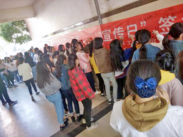 2017年11月9日是全國第27個“119消防日”,學院舉行了“119消防宣傳日”千人簽名活動,保衛處在北一棟教學樓處設一條十一米的簽名活動橫幅,橫幅的內容是:“為了你和他人的幸福,請自覺做好防火工作。