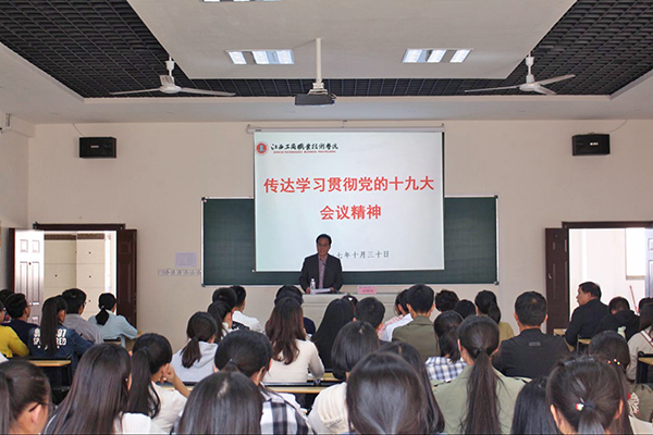 10月30日,江西工商職業技術學院召開黨委擴大會議,組織全院中層以上干部及部分黨員代表傳達學習貫徹了十九大精神。會議由黨委書記周瑾主持,院長劉明初、副院長傅江海、陳偉高、曠強軍、胡國輝出席,中層干部及部分黨員代表參加。
