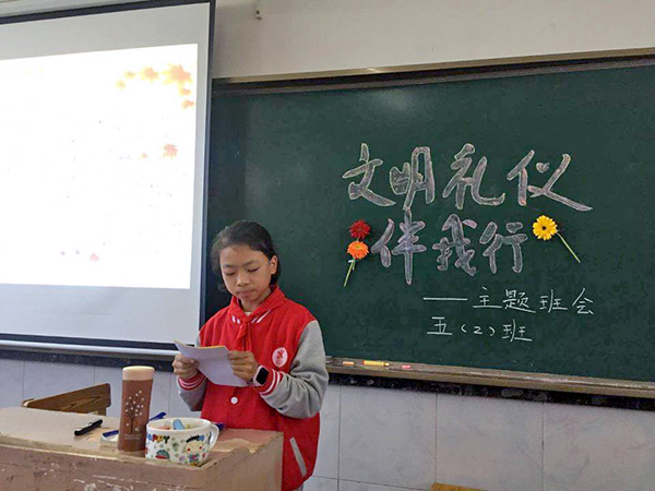 南昌現(xiàn)代外國語學校迎賓校區(qū)小學部11月份開展了《文明禮儀伴我行》主題系列教育活動。11月29日下午各班利用班隊會開展形式多樣的主題教育活動。有的班開展詩歌朗誦、有的班進行了演講比賽等。