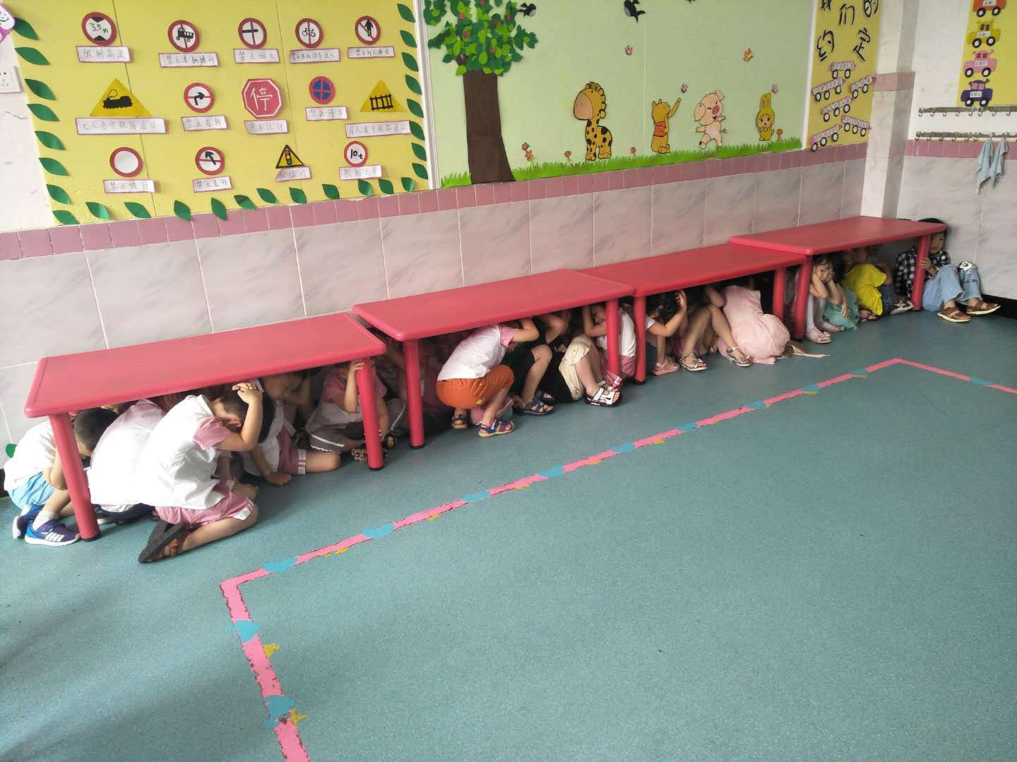 一分鐘后,信號員解除警報,各班教師組織幼兒用手或其他物品保護頭部,迅速有序地分別從各個安全通道緊急疏散到室外安全空曠的場地(一樓操場)。