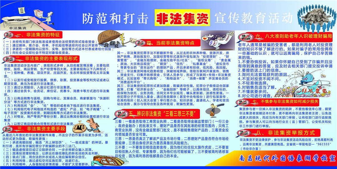 根據《南昌市2018年防范和打擊非法集資宣傳月活動實施方案》要求,以保護人民群眾切身利益、維護社會穩定為出發點,提高社會公眾對非法集資的識別能力,教育人民群眾增強風險防范意識,培養正確的投資理念,營造防范打擊非法集資的良好輿論氛圍,震懾犯罪分子,并以此擴大宣傳教育覆蓋面,增強宣傳效果,我校特開展防范和打擊非法集資宣傳教育進校園活動。