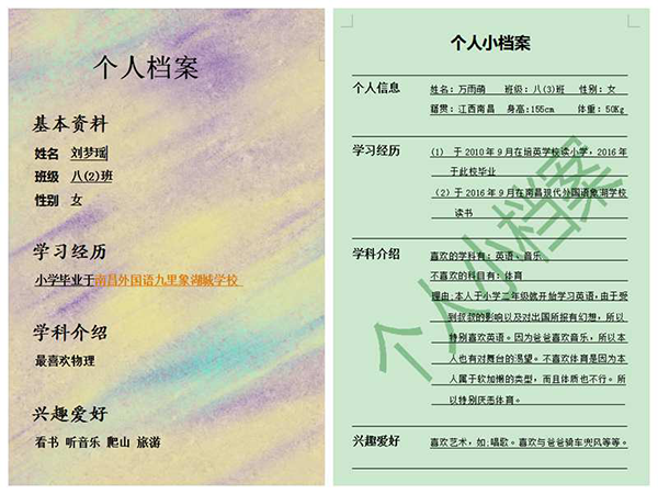 此次參賽作品的文字內(nèi)容包含四方面:一、基本信息;二、學(xué)科介紹;三、興趣愛好;四、自我評(píng)價(jià)。同學(xué)們以自己為主,發(fā)揮想象,根據(jù)自己的興趣愛好,自由創(chuàng)作。