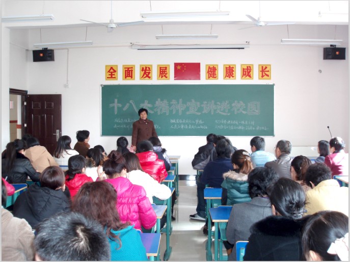 宣講會(huì)過(guò)程中,李金玉圍繞黨的十八大報(bào)告精神,結(jié)合學(xué)校的工作實(shí)際,提出了今后學(xué)校發(fā)展的一系列計(jì)劃和措施:大力推進(jìn)依法治校,進(jìn)一步落實(shí)立德樹(shù)人的根本任務(wù);加強(qiáng)和改進(jìn)中小學(xué)德育工作,繼續(xù)組織開(kāi)展中小學(xué)弘揚(yáng)和培育民族精神教育活動(dòng);深入實(shí)施素質(zhì)教育,推動(dòng)學(xué)校中華經(jīng)典誦讀、體育、藝術(shù)、衛(wèi)生與健康教育工作穩(wěn)步發(fā)展;加強(qiáng)教師隊(duì)伍建設(shè),提升教師專業(yè)化水平,抓好“青藍(lán)工程隊(duì)伍”建設(shè),進(jìn)一步提高教育質(zhì)量;維護(hù)學(xué)校安全與穩(wěn)定,加強(qiáng)學(xué)生安全教育,做好校園安全防范工作,做好學(xué)校傳染病防控工作,建設(shè)安全校園。李金玉要求,從現(xiàn)在開(kāi)始,全校教師要切實(shí)增強(qiáng)貫徹落實(shí)十八大精神的自覺(jué)性和堅(jiān)定性;要立足教育教學(xué)崗位實(shí)際,解放思想,實(shí)事求是,與時(shí)俱進(jìn),開(kāi)創(chuàng)進(jìn)取;要切實(shí)履行好工作職責(zé),站在民族復(fù)興的歷史新方位,迎接前所未有的復(fù)興曙光。教育工作者必須牢記使命,不忘責(zé)任,敢于擔(dān)當(dāng),為了培養(yǎng)建設(shè)祖國(guó)、保衛(wèi)祖國(guó)的棟梁之才,為早日實(shí)現(xiàn)中華民族偉大復(fù)興貢獻(xiàn)力量。