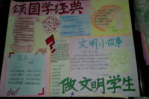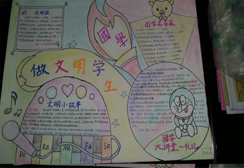 為營造更為濃厚的學國學氛圍,南昌現代外國語學校(象湖校區)掀起了國學經典進校園活動的熱潮。11月30日舉行了一場“頌國學經典,做文明學生”為主題手抄報比賽。