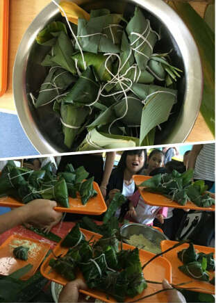 孩子們饒有興致地觀看了家長們包粽子的過程,家長們嫻熟的包粽子技術,令孩子們不停地拍手叫好,各年輕家長也躍躍欲試,現場拜師學藝,認真仔細的模仿每一個細節,三角形、棱形、枕頭形……五花八門的粽子出爐了,場面壯觀!