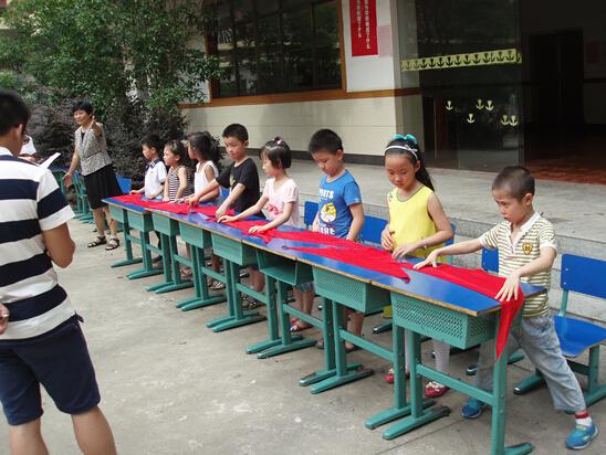 比賽開始前,校長李金玉宣布了競賽紀律、競賽規則及裁判員名單,宣布每個班級分別派出5-8名參賽隊員,根據年級不同而選定不同的競賽項目。比賽開始后,首個競賽項目是自主系紅領巾,由一年級三個班共15名選手參賽。待口哨一響,小選手們你爭我趕,情況很快有了變化:有的已經系好了紅領巾,而有的才開始疊,操場上“加油”、“加油”的吶喊聲、笑聲此起彼伏,令人忍俊不禁……