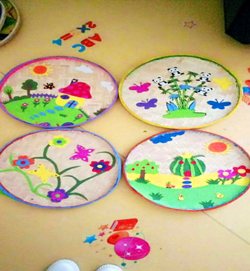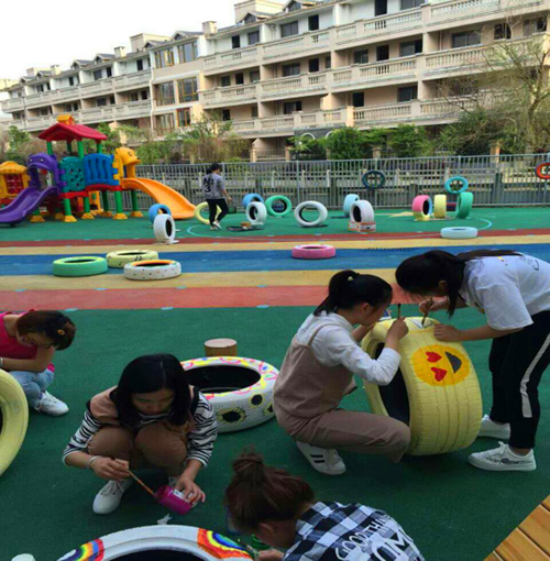 在環創活動中, 老師們都齊心協力,各盡其能,利用不起眼的廢舊輪胎,借助各種型號的畫筆,用油漆為輪胎耐心地打上底色,在此基礎上進行發散思維,利用工具,將多種顏色的油漆在廢舊輪胎上進行描繪、鏤空、刷畫等。經過半天的清潔、創意、裝飾,一個個黑乎乎的輪胎變身為點綴著愛心、漂亮花朵、笑臉、哆啦A夢等各種童趣圖案的作品。此外,還進行了竹編環創,一個個竹編上面粘貼著五顏六色的圖畫,真是別有一翻風味!