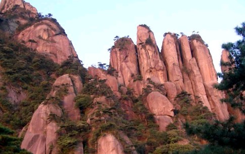 也許是一天的旅途太累了,也許是三清山的美讓人醉了,第二天一早我醒來的時候,竟然沒看到其他同事。外面天已微亮,沒辦法,為了不讓大家留下遺憾,我只得拿著攝像機跑到平臺上。此時,太陽還未升起,天空異常晴朗,東方已經是紅彤彤的一片,環顧四周,“五指山”業已染上了紅褐色,莊嚴而肅穆地矗立著;司春女神在晨曦中靜靜地俯視著群峰;布谷鳥的鳴叫聲回蕩在山谷中,是那么清脆動人。遠處高山上傳來的對話聲,想來也是同道中人。等了十幾分鐘后,我看到了一次雄偉、瑰麗的日出景象。一開始那旭日露出小小的一點,輝映著朝霞,光芒四射,令人不敢張開眼睛直視。我趕緊架好攝像機,記錄著這令人激動的一刻。過了一會兒,紅日冉冉上升,光照云海,五彩紛披,燦若錦繡,身后的“五指山”也已經從紅褐色變成了燦爛的金色。環望四周,恰好有一陣山風吹來,云煙四散,峰壑松石,在彩色的云海中時隱時現,瞬息萬變,猶如織錦上面的裝飾圖案,每幅都換一個樣式。我不禁感嘆,日出東方,壯哉!我大山河!